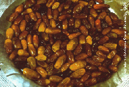 Too stiff and large for most home gardens, but adapts to and does well in seaside and desert gardens. Dramatic silhouette, emphasis plant. Very tall (up to 80 ft.) with slender trunk and gray green, waxy leaves. Multi-trunked by nature. Rigid, upright, open. Characterized by tough gray trunk and feather-duster crown of fronds. Gray-green leaflets stiff, sharp pointed. Suckers from base. Small yellowish flowers in large hanging sprays, followed by clusters of edible dates. Both male and female trees needed to produce fruit.