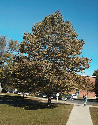 Good street, park or lawn tree; used in lines and blocks for formal plantings - avenues, screens, masses. 30-40 ft. spread; smooth cream-colored upper trunk and limbs. Fast growth to 40-80 ft.