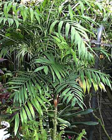 Slow growing, three to 6 feet in height and 1-2 feet in width. One of the smallest and most common indoor palms. Single stems with often several plants per pot. Leaves off single stem up to 24 inches in length. 21 to 40 linear or lance-shaped leaflets. Leaves often arching. Showy bark.